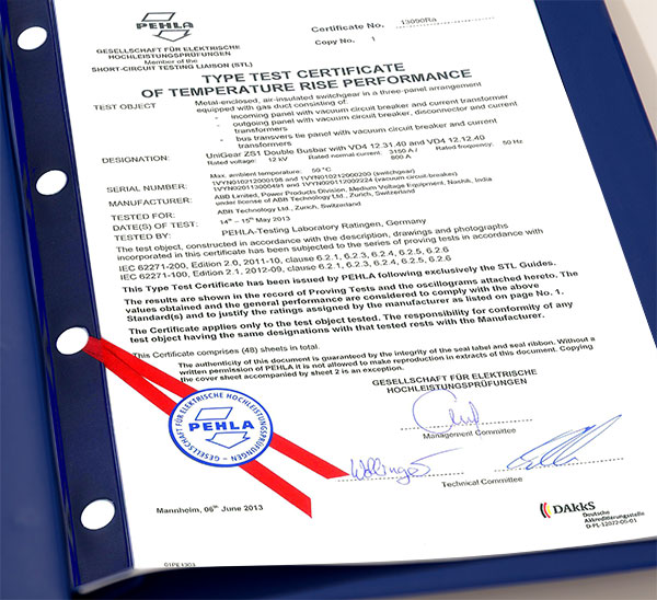 - STL Typprüf-Zertifikat für einzelne Typprüfung, z.B. STL Typprüf-Zertifikat für Erwärmungsprüfung (STL Type Test Certificate of Type Test, e.g. STL Type Test Certificate of Temperature-Rise Performance)